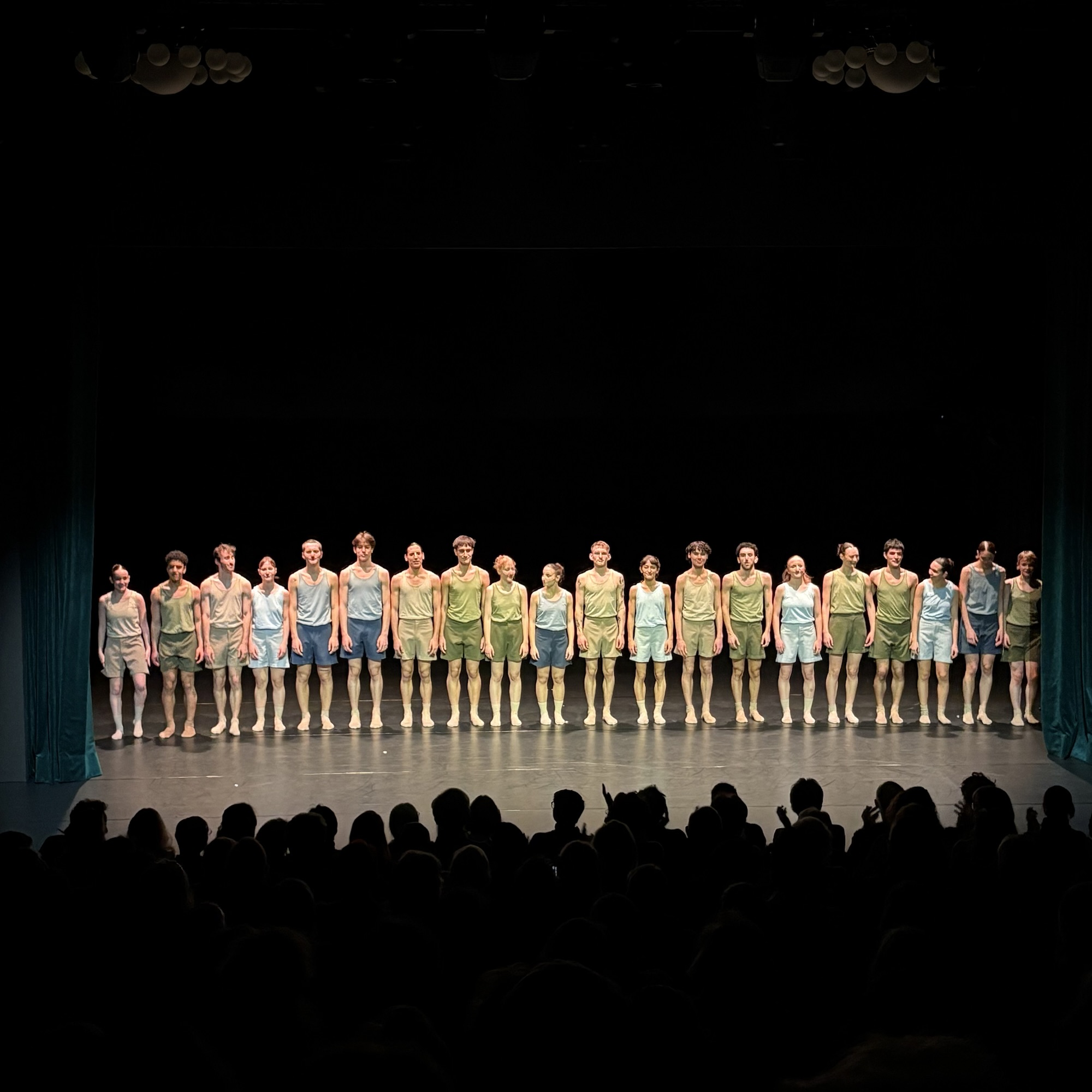 Neben Moraus Stück – dessen Arbeiten ich immer wieder grossartig finde – als Opener ist wohl „Tenir le temps“ von Rachid Ouramdane mein Highlight des Abends. Es ist eine Arbeit, die sehr viel Konzentration, Präzision und vor allem immense Ausdauer von den Tänzer:innen abverlangt und ist bestens bei einer derart jungen und energiegeladenen Kompanie aufgehoben. Das Stück entstand 2015 für die Kompanie L’A im Rahmen des Montpellier Festivals und beleuchtet das Zusammenspiel von Individuum und Gemeinschaft in Krisenzeiten: 15 Tänzer:innen bewegen sich in einem präzisen System aus rhythmischen Bewegungen und Domino-Effekten, finden dabei jedoch auch Momente tiefgreifender Individualität, die Spannung hält bis zum Schluss. Gemeinsam, ohne im Einklang zu sein, sichtbar in einzelnen Ausbrüchen von Soli und Duetten, zeigen die Darsteller einen gewaltigen Lebenstrieb, unterstützt von der eindringlichen Partitur des Komponisten Jean-Baptiste Julien. Sehr spannende Arbeit! Und wohlverdienter Schluss-Applaus im ausverkauften Saal…