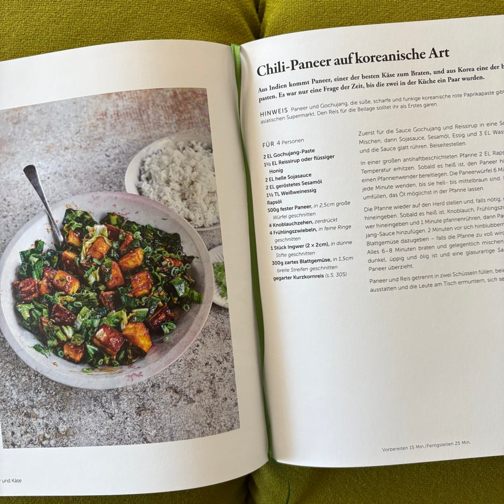Und bereits nach den ersten zubereiteten Gerichten aus diesem neuen Kochbuch Meera Sodhas kann ich guten Gewissens sagen, diese Gerichte machen glücklich, grossartig unser Auftakt mit den „Libanesischen Bohnen und dem Vermicelli-Reis“, die „Gebackenen Auberginen, Kichererbsen und Tomaten mit Tahin-Joghurt und Minze“ oder als tolles fusion-cuisine-Rezept der „Chili-Paneer auf koreanische Art“. Ich liebe Auberginen und es hat einige wunderbare Rezepte mit dieser Frucht (ja, die Aubergine ist tatsächlich eine Frucht…) in „HAPPY“. Alleine schon deshalb gehört dieses neu erschienene Kochbuch schon jetzt in die vorderste Reihe in unserem Kochbuchregal. Die Gerichte von Meera Sodha lohnen sich immer, das ist genau unser Geschmack, genau unsere bevorzugte Alltagsküche – vegan, vegetarisch, asiatisch – grossartig!