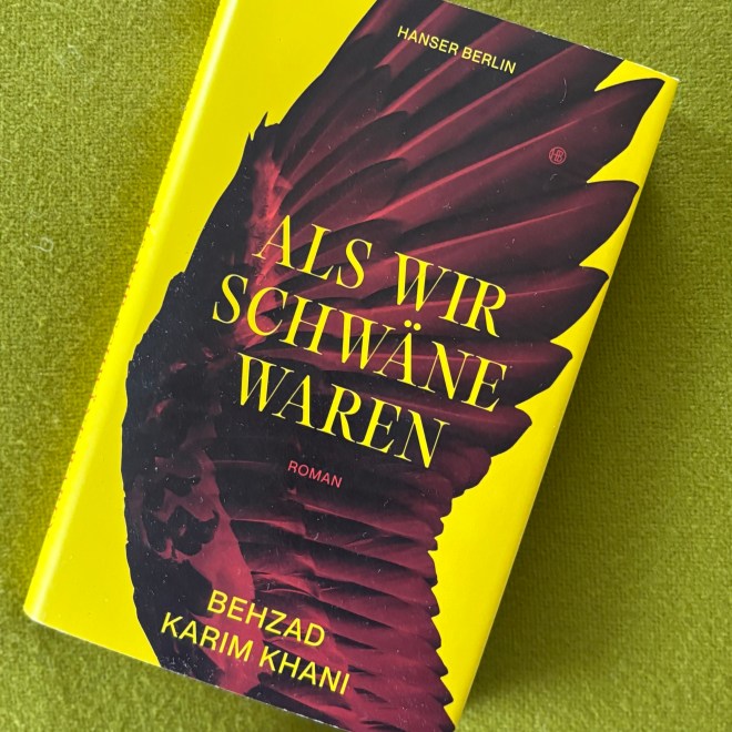 „Als wir Schwäne waren“ von Behzad Karim Khani, 2024, Hanser Verlag Berlin, ISBN 978-3-446-28142-4 (Werbung)