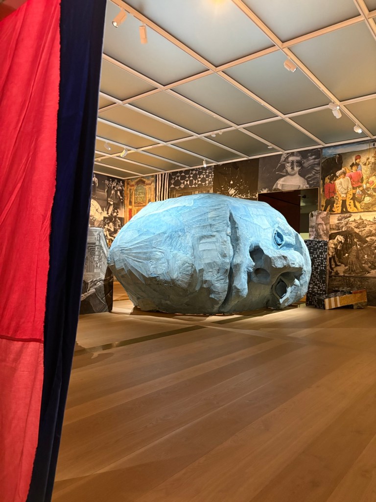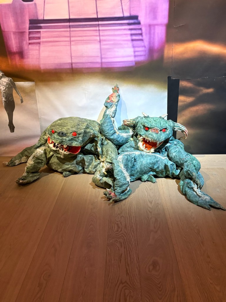 Chetwynds Werke werden in einer eigens von der Künstlerin geschaffenen Szenografie präsentiert – eine interessante, teils skurrile Mischung aus Skulpturen, Videoinstallationen, Performancedokumentationen, bunt, schräg, witzig, eine Melange aus Mittelalter und Popkultur, fröhlich und lebensbejahend. Man spaziert durch die begehbaren Objekte und bleibt zuletzt an der grossen Videoinstallation „Hermitos Children 1 – 3“ hängen, die wirklich sehenswert ist. „Im Zentrum der Filmreihe steht die telepathisch begabte Kommissarin Joan Shipman, die mit unkonventionellen Methoden und übersinnlichen Fähigkeiten rätselhafte Fälle löst – oft im Kontext sexueller Verbrechen. Die episodische Struktur der Filme verbindet Szenen aus früheren Performances mit skurrilen Charakteren, psychodelischen Bildwelten und absurden Handlungssträngen, wodurch eine fragmentarische, experimentelle Erzählweise entsteht. Chetwynd nutzt diese Elemente, um Themen wie Gender, Identität und gesellschaftliche Normen spielerisch zu hinterfragen“ (Kunsthaus Zürich).