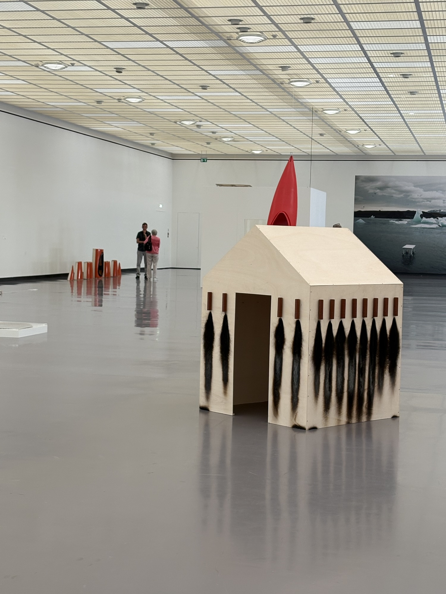 Bevor man dann in die anderen Gebäude zur Ausstellung „Landschaft“ mit Werken von Roman Signer wechselt, sollte man keinesfalls verpassen, noch kurz in der Eingangshalle einen Blick auf die farbintensive Grossinstallation des US-amerikanischen Künstlers Jeffrey Gibson zu werfen, die voraussichtlich bis 2026 dort zu sehen ist – leuchtend bunt, eine kraftvolle Mischung aus Skulptur, Gemälde, Perlenstickerei, Siebdruck, Keramik, Textilien….