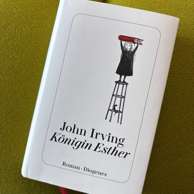 Natürlich ist „Königin Esther“ ein typischer Irving mit skurrilen Personen und köstlichem Humor. Sein letzter Roman, von dem ich dachte, dass dies sein Abschiedswerk sei, hatte viele Schwächen, hat mich stellenweise sehr gelangweilt. Und ich dachte, das war es nun mit dem Irving’schen Œuvre. Nun also diese überraschende Neuerscheinung: „Königin Esther“ ist wohl für jeden Irving-Fang grosses Lesevergnügen, dennoch dachte ich auch hier zu Beginn: Die Luft ist raus, Irving, mittlerweile 82 Jahre alt, schafft es nicht mehr wirklich zu packen und verliert sich in seitenlangen Banalitäten. Doch dann gibt es unverhofft viele Momente, in denen mir klar ist, warum ich seine Romane und Figuren liebe und – hurra – plötzlich nimmt dieser Roman Fahrt auf, macht mich glücklich, begeistert mich mit vielen liebevollen Details, wie etwa den Hund Hard-Rain, der bei Gewitter unbedingt eine Badewanne braucht, weil er dann grosse Haufen kacken muss oder das Kind namens Siegfried, das mit der Knoblauchpresse seine Plastikfiguren vernichtet. Das ist alles so typisch Irving! Zudem werden seine grossen Themen (Ringen, verschiedene Mütter, Amsterdam, Wien, Prostituierte, Tattoos, etc.) abgehandelt. Bis auf den Bären. Der kommt nicht vor. Schade eigentlich. Der Roman fühlt sich an wie eine grosse Irving-Retrospektive, wie eine Rückschau auf sein Werk, quasi ein Best-Of-Irving, das ist wunderbar, auch wenn die titelgebende Esther merkwürdig im Dunklen bleibt, wie ein Phantom. Man liest viel Neues und ausführlich Recherchiertes unter anderem zum Zionismus, zur jüdischen Diaspora, etc. – dazu viele wunderbare Seitenstränge und Anekdoten, auch wenn leider nicht alle Geschichten zu Ende erzählt werden und einige Fragen offen bleiben, aber vielleicht werden diese in noch folgenden Romanen beantwortet….? Das wäre schön. Ach, John Irving gefällt mir schon immer noch sehr gut. Und ich habe die leise Hoffnung, dass da noch mehr kommen wird.
