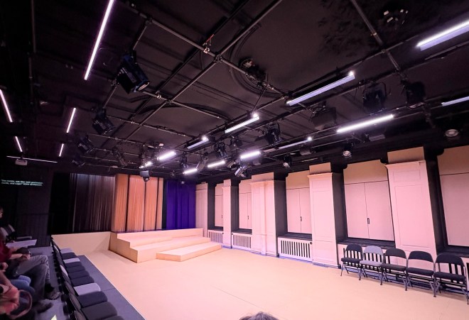 Man weiss nicht so recht, was einen erwartet, wenn man weder Teil 1, noch Teil 2 gesehen, sondern sich für den Directors Cut entschieden hat. Und so sitzt man im Saal, inmitten des interessant gestalteten Settings und harrt der Dinge. Wurde zuletzt auf der Webseite noch eine Dauer von 3-4 Stunden kommuniziert, so ist die Ansage von Intendant Mathieu Bertholet etwas kürzer, aber auch nicht präziser mit ca. 1,5 – 2,5 Stunden angegeben und dem Hinweis, dass man die Vorstellung auch verlassen kann, wenn man nicht mehr möchte. Aber schnell wird klar, dass man diese Produktion keinesfalls vorzeitig verlassen möchte, denn direkt von Anbeginn ist dieser Abend packend, spannend, toll, absolut sehenswert, egal ob man nun einen Bezug zu Romy Schneider hat oder nicht. Nach „Gilberte de Courgenay“ hat mich nun auch diese Produktion in der ersten Spielzeit unter neuer Leitung absolut begeistert. Bereits der dreissig Minuten dauernde Anfangsmonolog von SHABNAM CHAMANI ist grossartig, kurzweilig, eine interessante Collage an Textfragmenten!