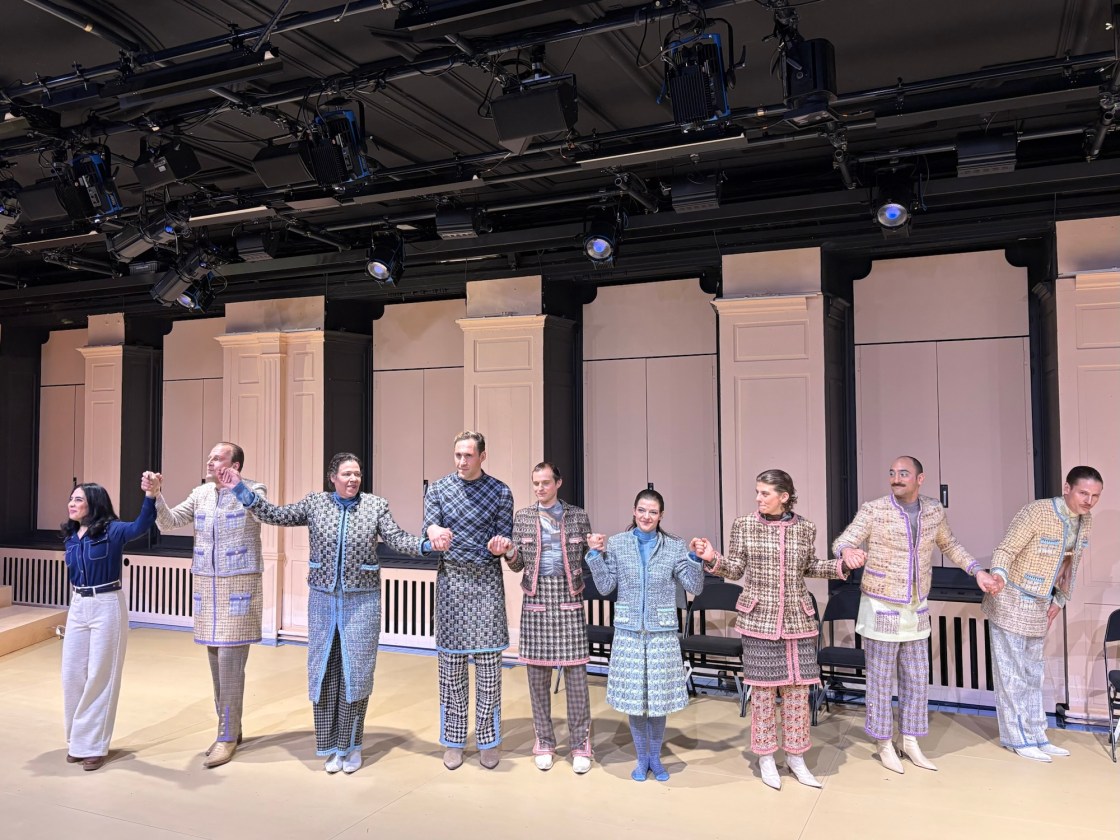 Man erlebt den Neumarkt-Saal in ungewohnt reduzierter, aber sehr schöner Ausstattung von ANNA WOHLGEMUTH & LEONARD EHRENZELLER und mit den wunderschönen Kostümen von ANNA PACCHIANI (love it! – auch die Überzieher für die Jelinek-Szene…), die Besetzung ist toll, präsent, spielfreudig, textverständlich im Französischen wie im Deutschen und stellenweise urkomisch (vor allem LISA URSULA TSCHANZ). Zu uns sprechen die Rollen aus 63 Filmen – wie wir erfahren, alle von Männern gedreht – und wir erfahren viel von Romys Befindlichkeiten, der Nazivergangenheit ihrer Familie, ihren Männern, aber auch Zeitgeschehen und feministische Fragen werden abgehandelt, der Text ist, kann man fast sagen, universell und wenn dann zuletzt Romy als Silhoutte vor den (sehr schön) beleuchteten Vorhängen steht und abgeht, so brennt sich dieses Bild ein und man wünscht sich fast, er möge doch noch etwas dauern, denn auch der Schlussmonolog ist ganz wunderbar. Und so vergeht die Zeit (wider erwarten) wie im Flug. Kurz vor dem Ende dann noch, fast schon eine Exkursion, dieser Pseudo-Jelinek-Text – gewohnt feministisch und politisch – hier aber als schnell trashige Comedy inszeniert, das ist famos und zum Schreien komisch. Elfriede Jelinek hat sich mit ihrem essayistischen Text „Die Kaiserin ohne Möglichkeit“ (in der Publikation Film-Konzepte 13 von 2009), kritisch mit dem Mythos und der Wahrnehmung von Romy Schneider in der Öffentlichkeit auseinandergesetzt, aber wie Romy zitiert wird: „Das meiste, was über mich geschrieben wurde, sind Lügen“ kann man auch hier davon ausgehen, dass es sich um eine schräge Erfindung handeln dürfte, eine Groteske, eine witzige und temporeiche Persiflage von Szenen aus „La Piscine (Swimmingpool)“ von 1969, dem Film schlechthin, wenn man an Alain Delon und Romy Schneider denkt (obwohl sie da schon gar kein Paar mehr waren…). Und auch wenn Romy eine Figur aus längst vergangenen Zeiten ist, es gibt so viele brandaktuelle Themen, die ebenfalls fast wie beiläufig abgehandelt und thematisiert werden, nochmals – der Text von Guillaume Poix ist grossartig! Im Programmzettel liest man, dass die Regisseurin diese Monolog-Komposition als „Sprachinstallation“ versteht und ja, genau so ist das, es fühlt sich an wie eine Partitur, sehr musikalisch, grossartig rezitiert, gespielt, gelebt von CHADY ABU-NIJMEH, ANOUK BARAKAT, MARTIN BUTZKE, SHABNAM CHAMANI, MIRIAM JAPP, MAXIMILIAN REICHERT, MAX KRAUS und YANN PHILIPONA. Und auch wie bei „Gilberte de Courgenay“ ist es ein zweisprachiger Abend (bietet sich natürlich auch bei Romy an) und genau das finde ich wunderbar, sicherheitshalber verteilt man vorher an der Tür noch die Übersetzungen der französischen Passagen ins deutsche, aber man mag fast gar nicht nachlesen, ob man alles versteht, denn so schön sind die französischen Momente von Yann Philipona und Chady Abu-Nijmeh, man könnte den beiden ewig zuhören. Und was mir auch noch ganz wunderbar gefallen hat – sämtliche Schauspieler:innen geben mir das Gefühl, genau und nur für mich zu spielen, so oft blicken sie einem direkt in die Augen, das ist so nahbar, so greifbar, so real, das hat eine ganz eigene Qualität. WAs für eine tolle Produktion, man liest es, ich bin ganz hin und weg. „Und dann, Romy Schneider“ ist ein wirklich sehenswerter Theaterabend! Bravi!