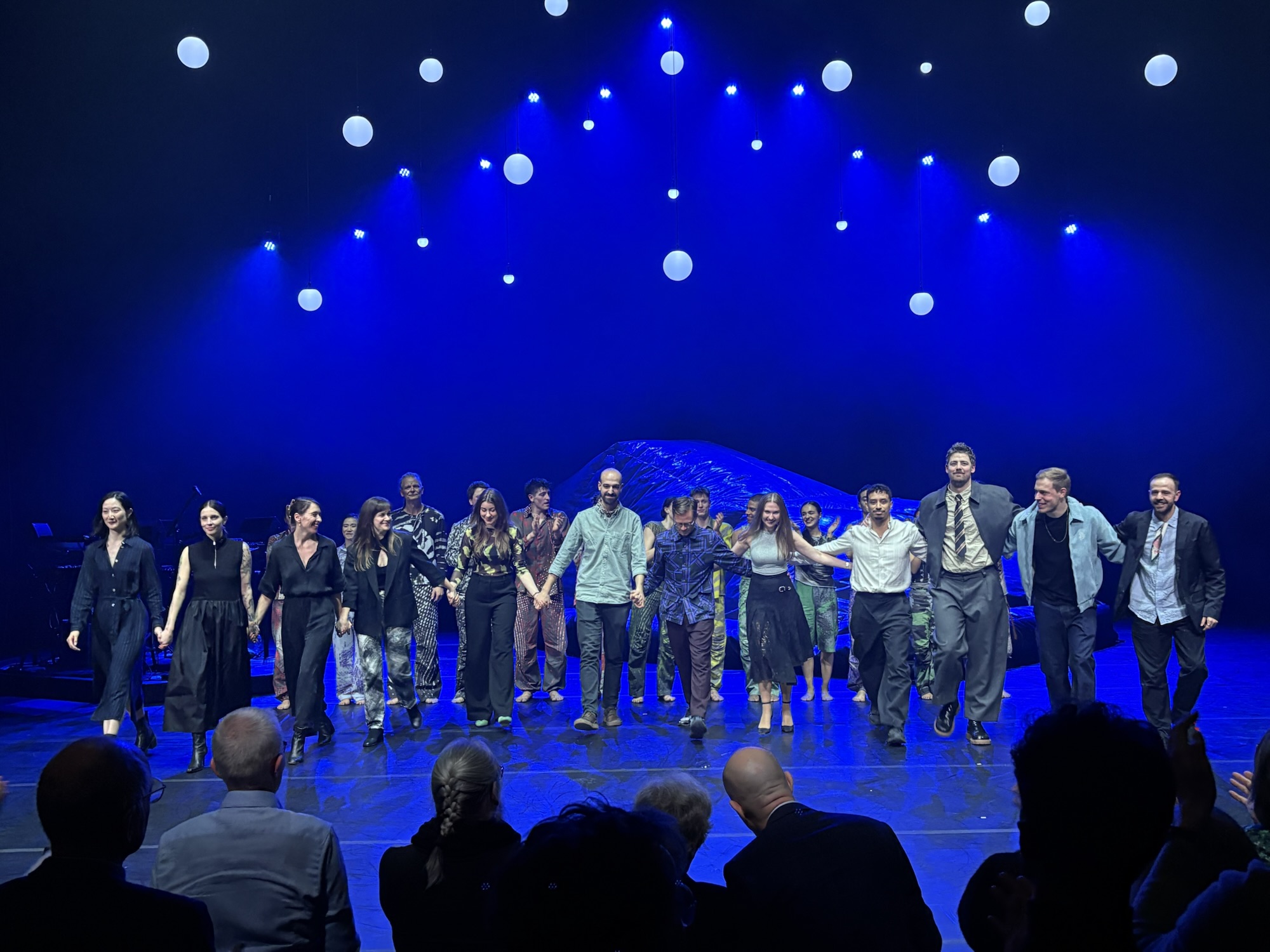 Nach der Pause dann ein komplett neues Setting – archaisch tauchen wir ein in die Natur, in die Bergwelt, in Urgewalten, die sich nicht nur tänzerisch in den Bewegungen manifestieren, sondern überwiegend und vordergründig durch die beiden Musiker CHRISTIAN ZEHNDER, einem Revolutionär des Obertongesangs, einem wunderbaren Vokalisten, und seinem Sohn TILL ZEHNDER, der für elektrische Musik und Sounddesign steht, getragen wird. Kraftvoll und ausdrucksstark tragen sie mit ihren beeindruckenden Klangwelten diesen zweiten Teil, man hat das Gefühl, dass dies alles aus der Tiefe kommt und sich auch tief im Inneren der Zuschauer:innen verankert, diese Ergriffenheit beim Anblick von nebelumwabernden Bergen und den Klängen und Geräuschen der Natur, fast geraten die Tänzer:innen etwas ins Hintertreffen, erobern sich aber immer wieder ihren ganz eigenen Platz, man hat Assoziationen von Urmenschen, von Dschungel, von der Entstehung des Lebens auf dieser Erde und von elementaren Erfahrungen, fernab unserer hochtechnisierten Welt, die aber natürlich in Form des Bandstands der beiden Musiker dennoch omnipräsent ist und irgendwie auch einen Gegenpart zu dieser Urgewalt bildet. Man muss sich darauf einlassen, auf diese Klänge, auf diese Bildsprache mit dem riesigen aufblasbaren Berg, der zuletzt dann doch in sich zusammenfällt, den der Mensch sich quasi untertan macht. Und zuletzt werden wir mit sphärischen Klängen und dem Mundart-Volkslied „Abendstern“ entlassen. Irgendwie entrückt geht dieser Abend zu Ende.