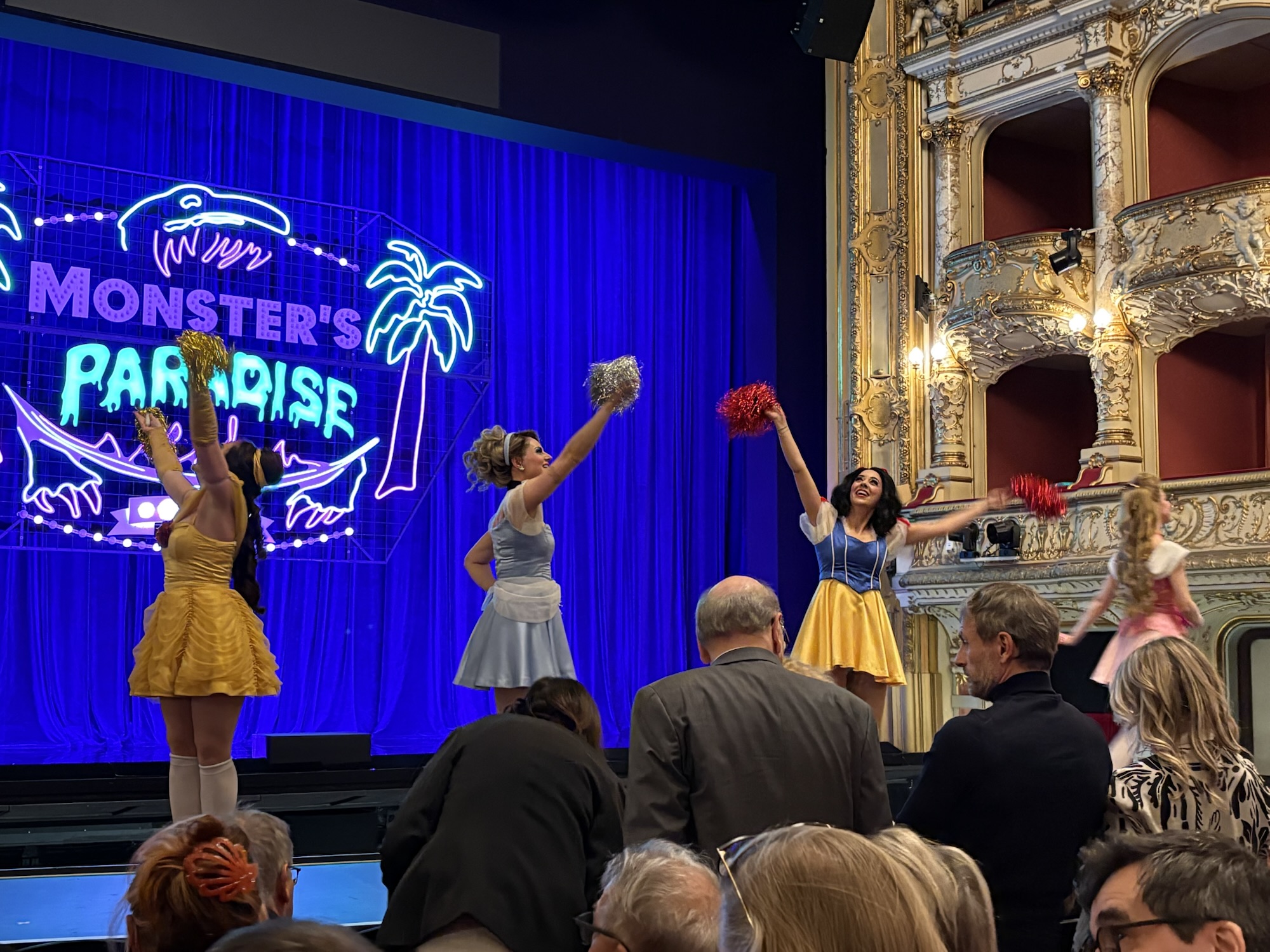 Jelinek und Neuwirth bringen sich dann auch gleich selbst und das auch noch gedoppelt auf die Bühne und nehmen uns als Vampiretten Vampi (Sängerin SARAH DEFRISE und Schauspielerin SYLVIE ROHRER) und Bampi (Sängerin KRISTINA STANEK und Schauspielerin RUTH ROSENFELD) mit auf diese Reise und direkt ins Oval Office des Weissen Hauses, hier residiert der König-Präsident und wir amüsieren uns zunächst prächtig über sämtliche Ikonen Amerikas, die er als Juror von „America’s Got Talent“ sofort per Buzzer rauswirft. GEORG NIGL als König-Präsident ist grossartig, herrlich skurill und eine genaue Studie von Donald Trump (gerne hätte ich hier auch den Alternate Robin Adams gesehen, den ich als Sänger und Darsteller ebenfalls super finde). Ihm absolut treu und untertänigst ergeben sind die beiden absolut famosen Countertenöre ANDREW WATTS (Mickey, des Königs höriger Adlatus I/Doppelgänger des Königs/Todesengel II) und ERIC JURENAS (Tuckey, des Königs höriger Adlatus II/Todesengel I) und wie immer grossartig der wunderbare Bassbariton RUBEN DROLE als ein Bär sowie die ebenso tolle Leistung von ANNA CLEMENTI mit elektronisch verfremdeter Stimme als Gorgonzilla (in dessen Körper VANESSA KONZOK steckt…). Überhaupt ist dieses Werk ein Aufgebot an musikalischem Effort und Elektronik, so dass in den hintersten Parkett-Reihen auch ein Tonpult (für die grosse Ton-Equipe MARKUS NOISTERNIG (Live-Elektronik), OLIVER BRUNBAUER und Olga Neuwirth (Sound-Design und Samples) sowie JULIEN ALÉONARD (Klangregie)) installiert ist, plus weitere Monitore zum Sichtkontakt mit dem musikalischen Leiter der Produktion TITUS ENGEL. Virtuos ist es schon, dieses gewaltige Klangchaos, dass doch immer wieder zu harmonischen sanften Melodien führt und zuletzt – wenn Vampi und Bampi nach dem Weltenbrand auf einem Floss mit Konzertflügel in den Sonnenuntergang, in die Dämmerung, in eine neue und bessere (?) Welt segeln, harmonisch-disharmonisch und gefühlt neverending – langsam ausläuft und man etwas erschöpft von dieser überbordenden Fülle an Klängen und Bildern und einer Rockkonzert-Dynamik das Haus verlässt und das Bellevue plötzlich ruhig und still erscheint. Neuwirths Musik ist eine gekonnte Melange aus unterschiedlichen Genres und Verfremdungen – höre ich da Schubert und Johann Strauss? und natürlich die amerikanische Nationalhymne? klar! – sowie interessanter Instrumentierung mit Drumkit (LUCAS NIGGLI) und E-Gitarre (SETH JOSEL), dazu viel (gedämpfte) Blech-Bläser und immer wieder auch sehr jazzig angehauchte Momente. Das macht Spass und gibt dem Besuch im Opernhaus Zürich definitiv ein komplett neues Feeling, ebenso Pre- und Pausenshow von Cheerleadern und Zombies, die durch die Gänge und Treppenhäuser streifen.
