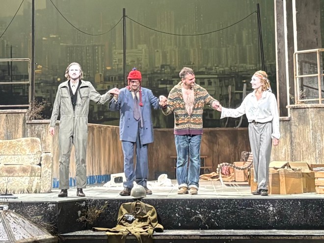 Es ist nicht so einfach, Zugang zu den Werken Samuel Becketts zu finden, man muss sich darauf einlassen und akzeptieren, dass man eher Zustände und nicht zu klärende Fragen, weniger Dramatik zu sehen bekommt. Das ist nicht jedermanns Sache, nun kommt jedoch mit der Musik Kurtágs eine weitere Dimension hinzu, die noch etwas tiefer einsteigt und viel vom Innenleben der Protagonisten zeigt, dieses nach aussen stülpt, somit erfahrbarer macht. Leichte Kost ist „Fin de Partie“ dennoch nicht, aber wenn man sich darauf einlässt, sich ganz dem Werk und dieser Musik hingibt, offen bleibt, ist es eine wirklich grossartige und packende Erfahrung und ein Blick in die Abgründe, aber auch absurde Komik der agierenden Figuren. Kurtág, der im Februar seinen 100. Geburtstag feierte, begann erst mit 85 Jahren diese Komposition, arbeitete mehrere Jahre daran, ursprünglich von Perreira in Auftrag gegeben und letztlich 2018 an der Mailänder Scala uraufgeführt, mittlerweile an mehreren Häuser gespielt und nun also in Basel im grossen Haus zu sehen. Im Grunde genommen geht es in „Fin de Partie“ um Abhängigkeiten, hier vor allem um die Abhängigkeit zwischen Clov und Hamm, sie bilden den Mittelpunkt, das Zentrum des Stücks sowie die Frage nach dem Ende, das Warten auf den Tod, diese Unausweichlichkeit des Lebens, die Gefühle hin- und hergerissen zwischen der Angst vor dem Tod und gleichzeitig einem Herbeisehnen des Endes. Die Zeit bis dahin vertreibt man sich mit Geplänkel, mit Sinnlosigkeiten, mit Absurditäten – typisch Beckett eben. Regisseur David Martons Fokus ist der Blick auf die Familienkonstellation und er verlegt die knapp zwei Stunden dauernde Handlung auf das Dach eines Hauses (Bühne und Kostüme: MÁRTON ÁGH), verzichtet auf die eigentlich von Beckett vorgeschriebene klaustrophobische Enge, gibt seinen Protagonisten Raum, Luft, Weitblick und die Möglichkeit des Entsorgens, des sich fallen lassens – das ist absolut stimmig und schlüssig, man stellt dies keine Sekunde in Frage. Die Protagonisten bewegen sich in einer Freiheit, sind gleichzeitig durch den Raum in ihrer Beweglichkeit begrenzt, die Zeit zieht dahin, wie die Vögel, die permanent den Backdrop mit der projizierten Silhouette einer (irgendwie toten) Stadt überfliegen, zuletzt wie im Strudel in den Himmel gesaugt werden, ist das die Erlösung? Nein, es gibt keine Erlösung aus diesem Dilemma des Wartens, denn alles wiederholt sich, immer wieder, immerfort und so ist es nur konsequent, dass zuletzt ein Kind die Bühne betritt, – dann, wenn Hamm bereits wieder unter den Kleidungsstücken (aus denen er zu Beginn aufgetaucht ist) verschwunden ist – und alles beginnt von vorne, das ist „the circle of life“: Anfang, Ende, Neubeginn. Es gibt kein Entrinnen. Das ist ein starker Moment, denn es ist auch das Prinzip Hoffnung. Die Apokalypse ist in dieser Lesart wohl eher ein Zustand der sich auflösenden Familienkonstellation. Die Protagonisten bewegen sich zwar, aber es herrscht Stillstand in dieser Gruppe, man blickt zurück (etwa mit einer Diashow aus längst vergangenen Zeiten…), nicht nach vorne. Einzig Nell verlässt selbstbewusst die Szene, entflieht dieser Situation, sie springt ins Meer und scheidet vorzeitig aus diesem „Endspiel“ aus. Und musikalisch? Es ist erstaunlich, wie vermeintlich die Musik beim ersten Hören dahinplätschert, dabei gibt so viele subtile Momente und immer wieder: Stille. Ich finde es sehr interessant, dass bei diesem relativ gross besetzten Orchester nur äusserst selten mehrere Instrumente gleichzeitig spielen (ein tutti gibt es wohl gar nicht?), häufig ist es eine Collage verschiedener Klänge, immer wieder einzelne, dramaturgisch gut gesetzte Akzente, weniger ein Zusammenspiel. Überhaupt sind es die vielen Pausen, die mehr aussagen, als das, was wir zu hören bekommen. Die Partitur ist unglaublich farbenreich und subtil und ich muss zugeben, dass ich in der Vorbereitung zu Hause, beim Hören verschiedener Aufnahmen nicht so viel damit anfangen konnte, jedoch zusammen mit dem Bühnengeschehen, ergibt sich für mich ein derart komplexes und stimmiges Gesamtbild, dass tief einfährt und mich sehr berührt. Unter der musikalischen Leitung von GÁBOR KÁLI spielt das SINFONIEORCHESTER BASEL absolut konzentriert und fokussiert diese manchmal so minimalistisch erscheinende Musik, dann gibt es wieder Sequenzen, die wie ein Klangbogen, ein Gebilde angelegt sind. Das Bühnengeschehen bildet fortwährend eine Einheit mit der Musik aus dem Graben. NATHAN BERG beglückt als Hamm, lässt uns tief in sein Innerstes blicken, MICHAEL BORTH als Clov ist ständig in Bewegung, findet keine Ruhe, seine Hyperaktivität kompensiert er mit dem langsamen Auslöschen von Dingen, von Gegenständen des Lebens dieser Familie, seiner Mitmenschen, URSULA HESSE VON DEN STEINEN als Nell ist die buchstäbliche Leichtigkeit (sowohl musikalisch, als auch in ihrem Spiel) inmitten dieser dumpfen, schweren Männerriege, wie leichtfüssig sie sich durch dieses endzeitliche Leben balanciert ist fast schon bewundernswert und dann gibt es da noch RONAN CAILLET als Nagg (Nells Mann), der irgendwie viel jünger und agiler als sein Sohn Hamm daherkommt, das irritiert mich etwas. Ein wirklich hervorragend besetztes Ensemble!